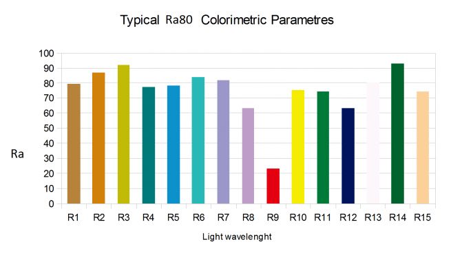 The CRI index (Color Rendering Index) measures fifteen different color samples, covering values R1–R15. Compared to the Ra index, CRI provides a more accurate assessment of a light source’s color rendering, as it also includes the R9–R15 values.